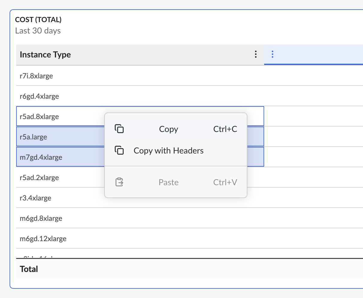 With the recent update to Cloudability Dashboards UI we modernized the component we use to display tables in Dashboards. As you mentioned, this changed how the select and copy functionality works but this functionality is still supported. You should be able to select multiple table cells by holding Shift or Command/Control buttons on your keyboard, depending on your operating system. Then you can copy the values from the table by selecting "Copy" from the right-click drop down menu or by simply pressing Ctrl/Cmd + C: