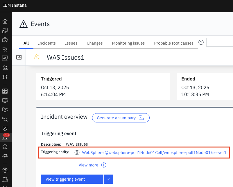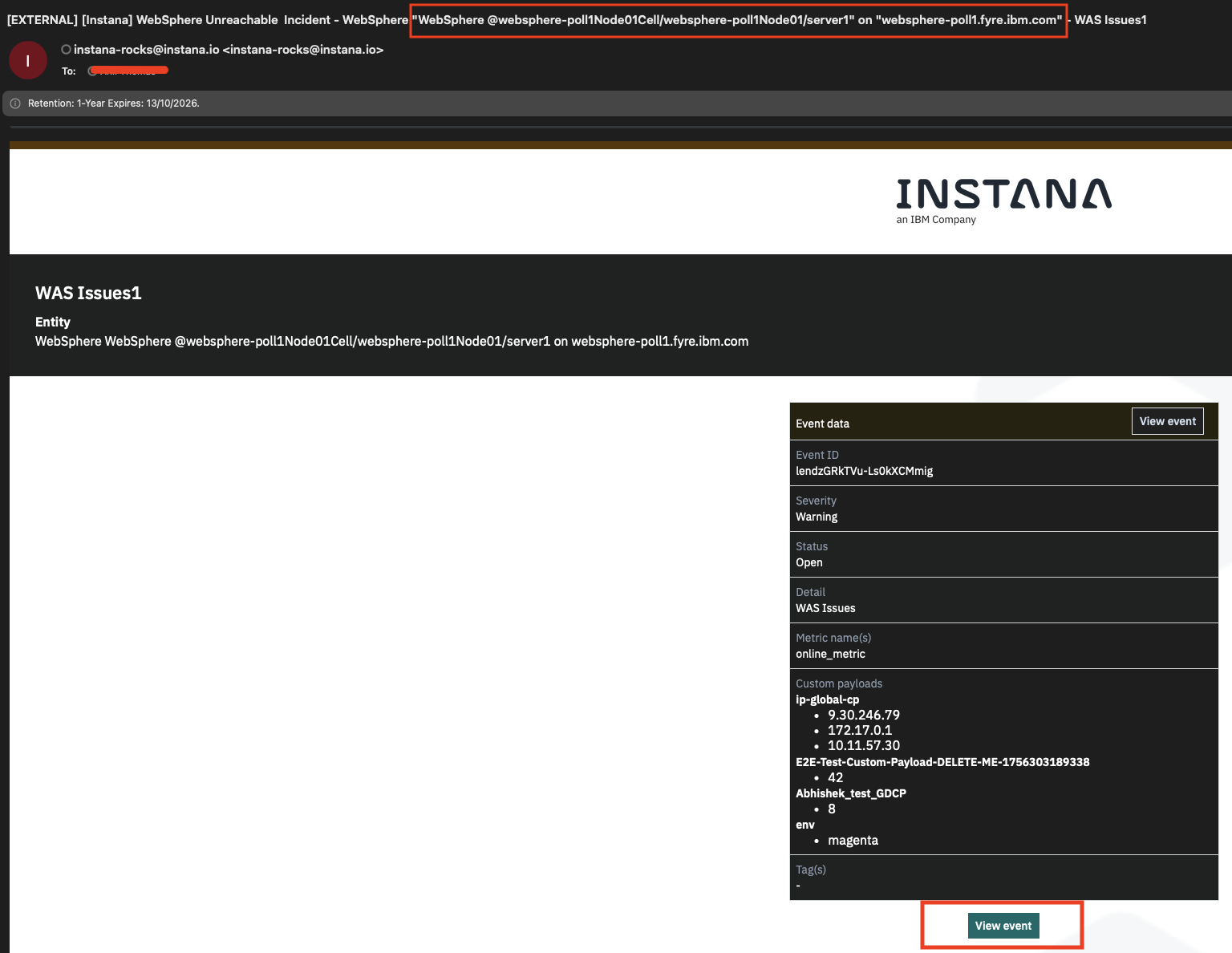 Currently an email alert generated from an 'Offline Event' for WebSphere contains details such as the Node Name and Host name. It also contains a link to the WebSphere entity that triggered the same which in turn leads to the WebSphere dashboard containing the Node name and other details. Please find the sample screenshots below, does this address the details requested for in the alert.