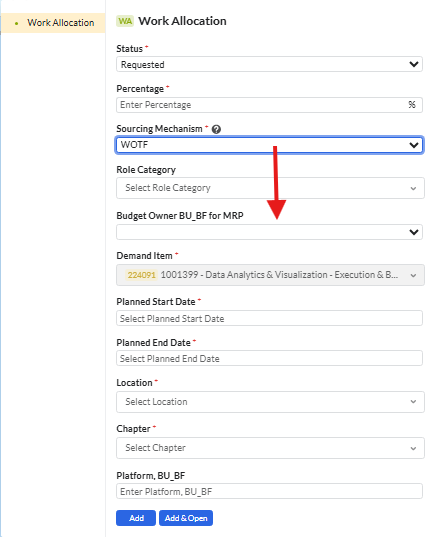 We want use mashup to populate a new field in the quick add form based on selection of values of another field which is already existing in the form. In the screenshot attached, when "WOTF" value is selected from the sourcing mechanism (Existing field) a new field Budget Owner BU_BF for MRP should be displayed.